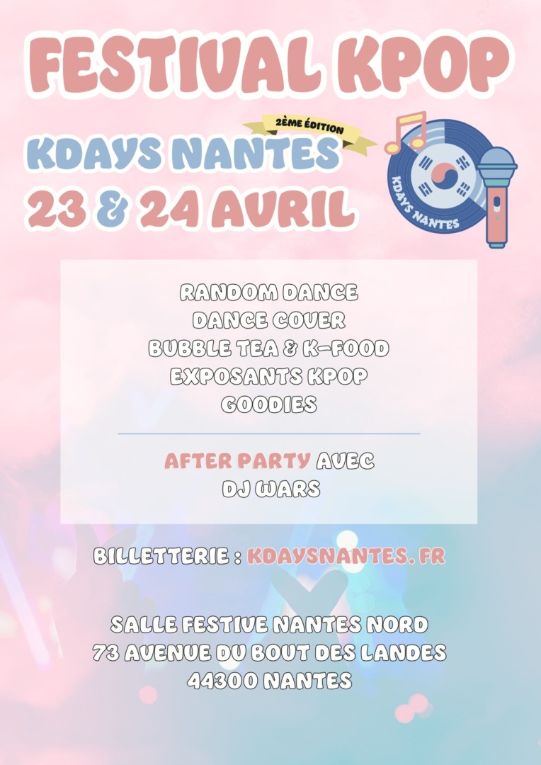 Kdays, le festival de K-pop revient à Nantes du 23 au 24 avril 2022. Au programme de cette deuxième édition dans un tout nouveau format : blindest, random playdance, dance cover, after party, restauration coréenne… de quoi réjouir curieux et amateurs. Unique dans la région, le festival promet une ambiance explosive et extraordinaire sous le signe de la bienveillance. Alerte gros lot : une place de concert pour le célèbre groupe ATEEZ est à gagner !