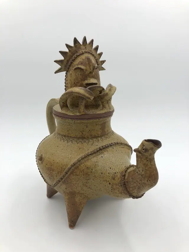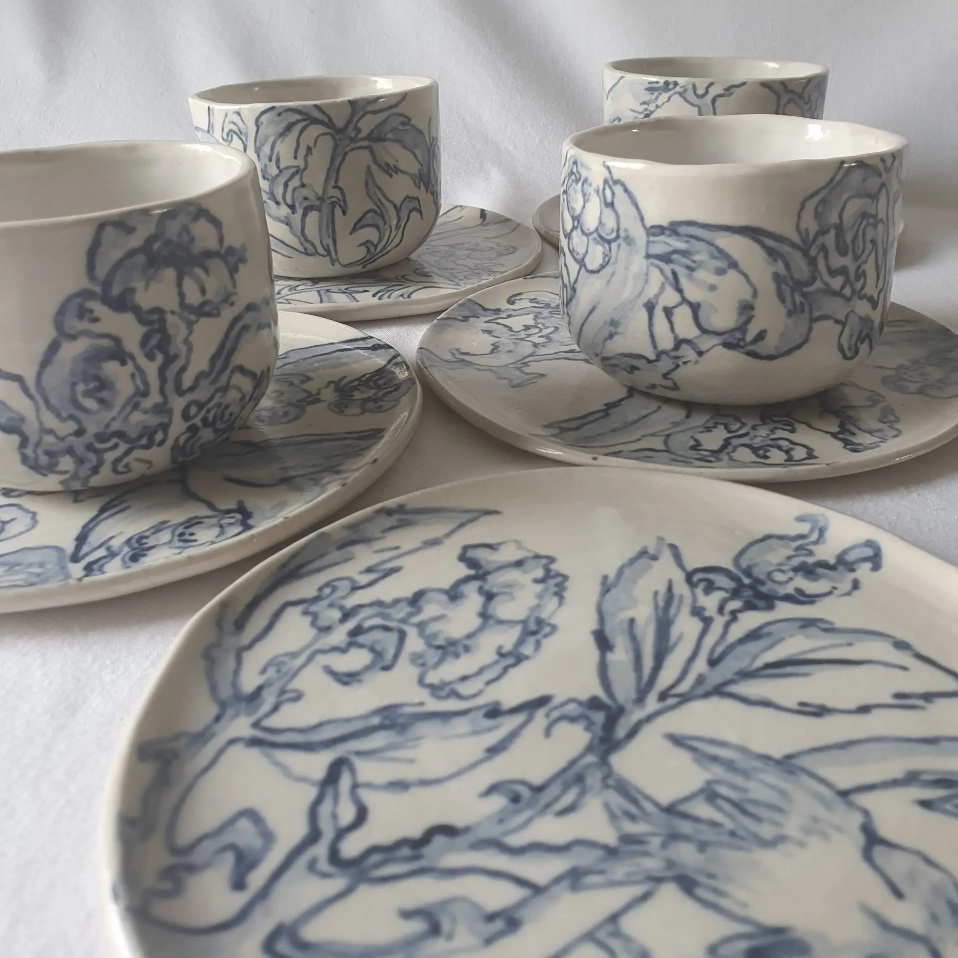 Mathilde Dumousseau explore le grès et travaille une gamme majoritairement utilitaire autour du bol, mais aussi des pièces sculptées inspirées des masques du monde. Elle fabrique ses émaux. Elle travaille à la plaque et au colombin, une technique primitive de la poterie qui existe depuis la préhistoire. Depuis 2024 elle prend en main son four à bois type olsen.