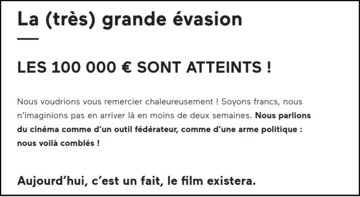 Le crowdfunding doit servir à financer une partie du film (tournage, montage, équipes…), mais aussi à démontrer aux éventuels investisseurs que le film suscite l’intérêt d’un public, garantissant un minimum de retour sur investissement une fois le film distribué. Objectif atteint : à quelques jours de la fin du projet de financement participatif, le projet KissKissBankBank totalisait déjà 135 000 € de dons, effectués par plus de 4000 contributeurs particuliers. L’équipe du film commente sur la plateforme : « Votre soutien est un formidable encouragement et montre que nous partageons cette volonté de mettre la question de la justice fiscale au cœur du débat public ». Ils engagent toutefois leurs soutiens à poursuivre l’effort de financement participatif, soulignant « qu’avec plus d’argent, on fait mieux et plus ». Ils espèrent atteindre les 200 000 € avant le 15 février, date de début du tournage. Pour le reste du budget, les recherches continuent…