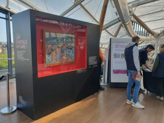 Le dispositif Un jour, Une œuvre de SNCF Gare & Connexion se poursuit à Rennes, ce mercredi 17 mai 2023. Issu des collections du Musée de Bretagne, le tableau Douarnenez chaloupes aux Plomarc’h de Mathurin Méheut s’installe en gare !