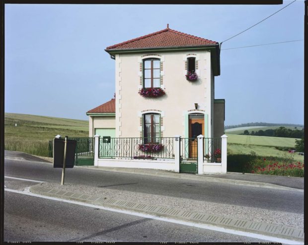 Le grain exceptionnel de la Kodachrome 64 et la qualité de l’impression donnent aux murs sombres des rues interminables, mais quasiment désertes, un caractère de décor de théâtre où jouent des enfants. L’objectif grand-angle du Leica dans des cadrages rigoureux envoie le regard errer dans des perspectives tendues vers un horizon où le noir rejoint le gris. Et puis comme une annonce de son travail intitulé en 2010, « La France », il y a ces façades figées dans le temps, façades silencieuses et parlantes à la fois. Désertes ou animées par un personnage adossé aux murs lépreux. Des façades comme des vestiges de lieux appelés à disparaître et qui en disent long sur la vie des gens de peu, souvent absents des clichés.