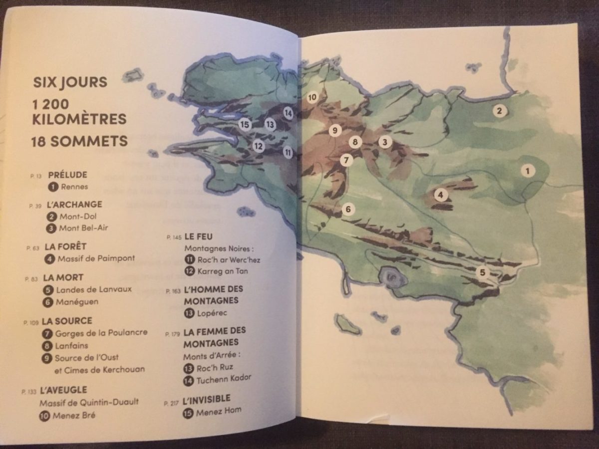 « Mon itinéraire mûrissait depuis de longs mois. Je rejoindrai le Mont-Dol à partir de Rennes avant de filer vers le Mené puis de faire escale sur le massif de Paimpont, de gagner les landes de Lanvaux vers Rochefort-en-Terre et de traverser le Morbihan d’est en ouest jusqu’à l’éminence sacrée du Manéguen. J’atteindrai ensuite les hauteurs dominant la vallée du Blavet au niveau de Guerlédan. Je visiterai Lanfains, le plus haut bourg de Bretagne. Je ferai un crochet par le Menez Bré et repartirai vers le sud par la route de Callac. J’entrerai dans les Montagnes Noires autour de Glomel et pousserai jusqu’à la montagne de Laz, en surplomb de la vallée de l’Aulne. Je pénétrerai dans l’Arrée par le sud. J’escaladerai le Roc’h Ruz, point culminant de la Bretagne, enfin terminerai en beauté par l’ascension du Menez Hom. »