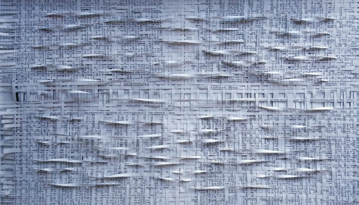 Aujourd’hui, il a à son actif entre 400 et 500 œuvres littéraires devenues plastiques, toujours motivé par cette idée de donner une présence physique à ces œuvres uniques, choisies dans leurs langues d’origine et dans leur intégralité. « Je me suis aperçu que je pouvais faire autant de tissages qu’il existait de livres, et j’ai commencé ainsi ma bibliothèque des œuvres tissées », nous dit-il. « Avec une règle et un cutter, en prenant garde à ne pas couper le texte, je lui donne vie. Avec moi, ils obtiennent une présence ».