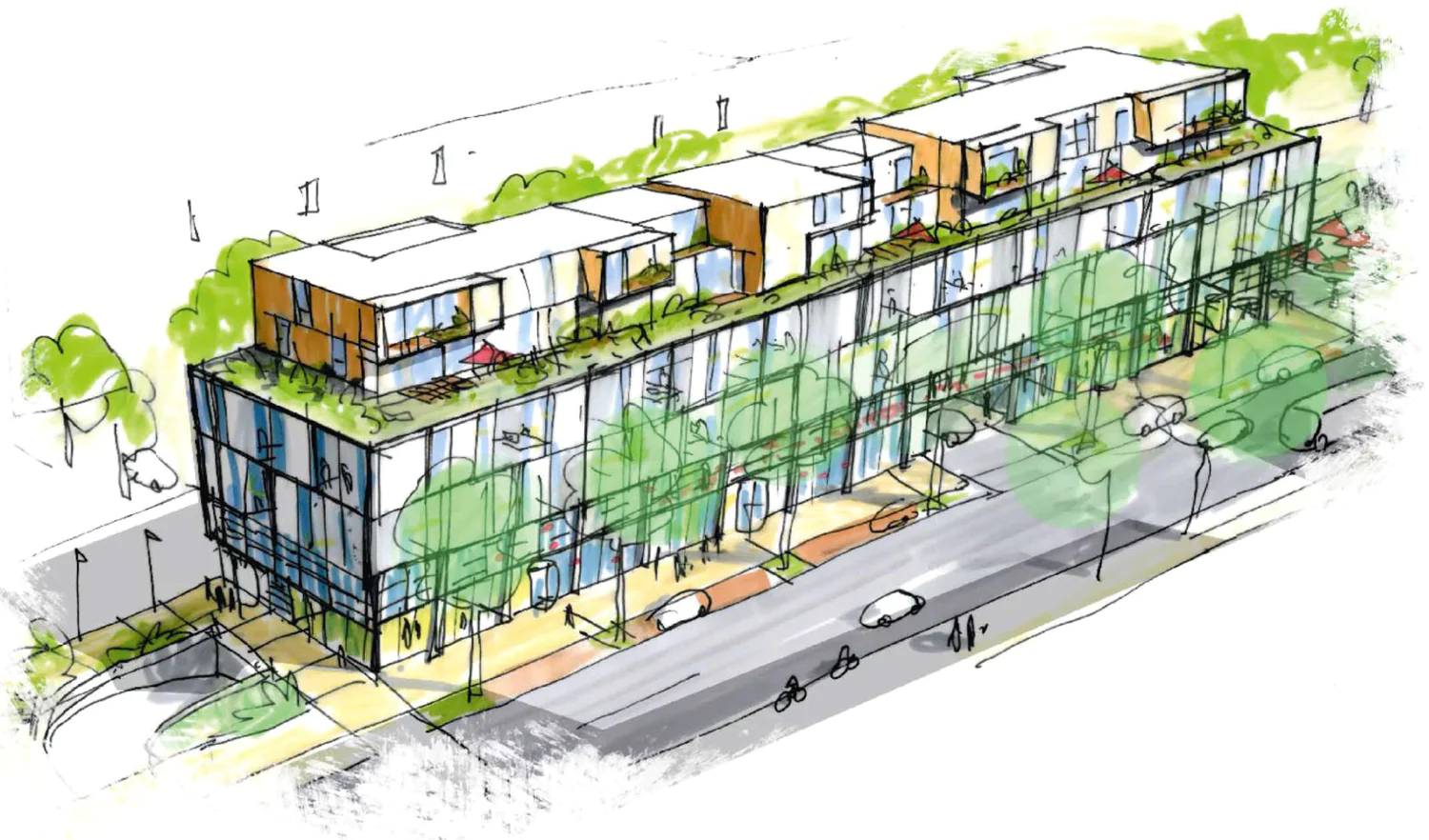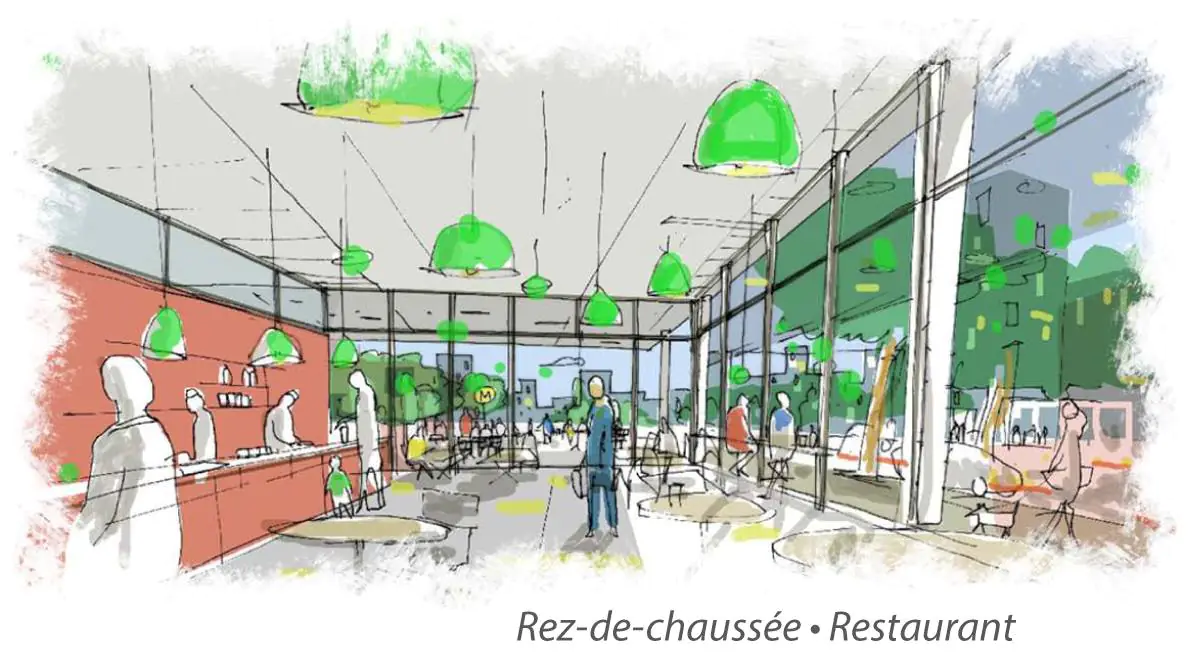 - une façade du rez-de-chaussée largement ouverte sur la rue, son restaurant et ses boutiques s’imposant comme la vitrine du projet ;