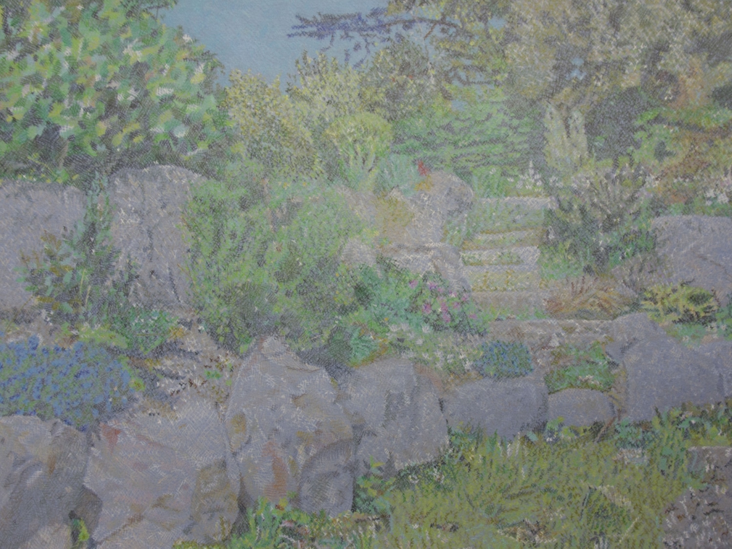 Artiste topographique, Gwenn Mérel arpente le paysage, observe, prélève, capte l’atmosphère, les couleurs et les lumières des portions de nature parcourues. Les éléments iconographiques capturés sont le point de départ de son travail plastique, utilisant différents médiums. Elle s’adonne en particulier au dessin et à des techniques ancestrales telles que la broderie, le tricot et le travail du tissu. Des ouvrages qui demandent concentration et patience, un labeur qui contraint à prendre le temps.
