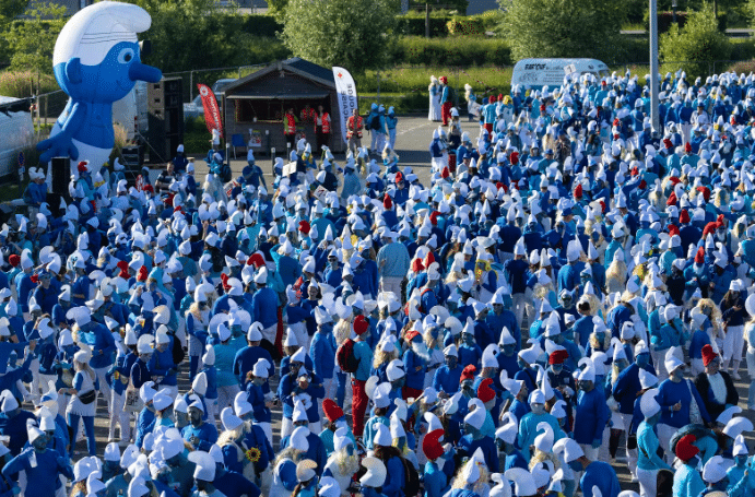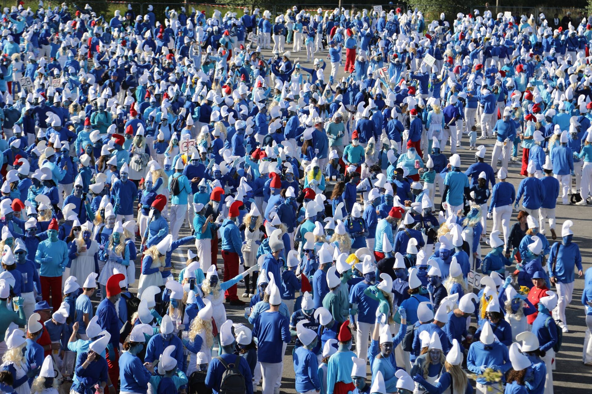 Les rues de la ville ont été littéralement envahies par une marée bleue, dans une ambiance festive, joyeuse et intergénérationnelle. Grands Schtroumpfs, Schtroumpfettes ou Schtroumpf à Lunettes ont convergé ; des milliers d’hommes et de femmes à bonnet blanc, parfois rouge et visage bleu ont été inspirés par les célèbres lutins de l’auteur et dessinateur belge Pierre Culliford, alias Peyo (1928-1992)