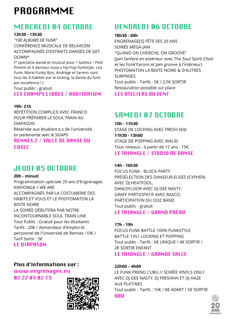 Cette nouvelle édition du Funk prend les Rennes se déroule sur une année très particulière : celle des 20 ans d’Engrenage[s] ! Hors de question de ne pas célébrer cet anniversaire. Depuis ses débuts, Engrenage[s] a pour vocation de réunir les gens autour du funk, du hip-hop et du groove. Et cette 6e édition du festival ne fera pas exception.