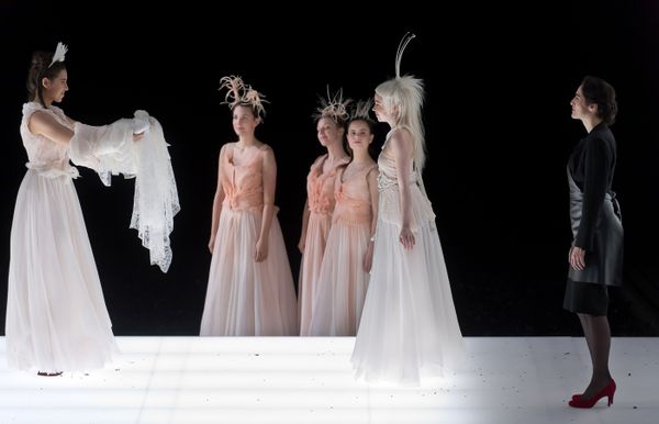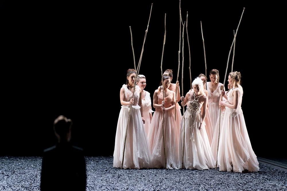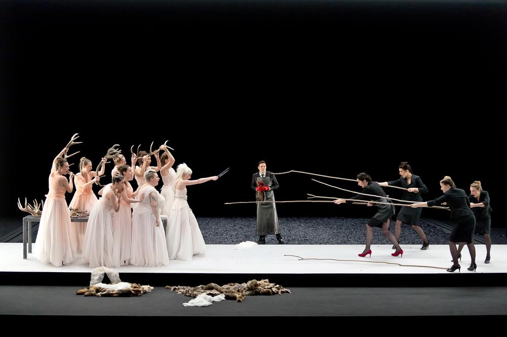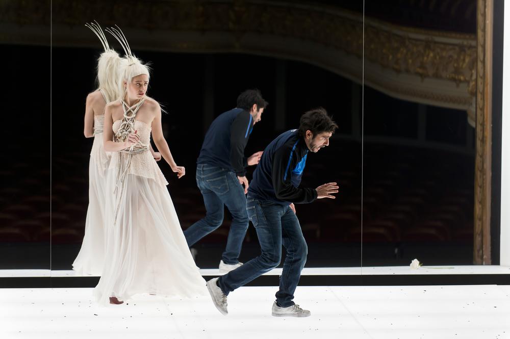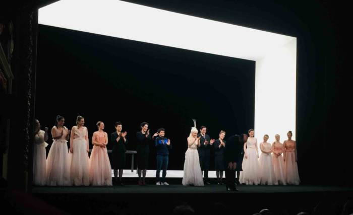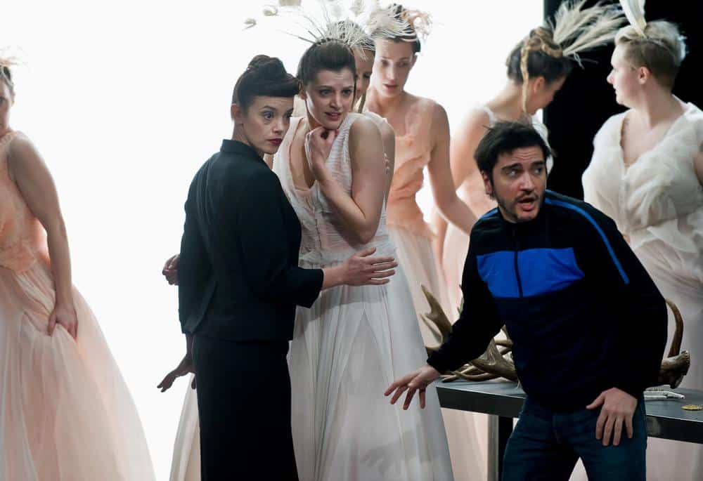 Véritable réussite que cette coproduction des opéras de Lille, de Rennes et de la fondation Royaumont. La chose la plus immédiatement saisissante est le décor. Sorte d’écran de télé géant aux parois intérieures d’un blanc immaculé, il met le spectateur dans une position de quasi-voyeurisme. Le metteur en scène Daniel Jeanneteau et son collaborateur Olivier Brichet, en choisissant une voie épurée, focalisent notre attention et intensifient ce sentiment de concentration de l’œuvre. Les lumières jouent un rôle tout à fait essentiel. Marie-Christine Soma en les poussant jusqu’à des intensités aussi éblouissantes que peu habituelles, réussit à rendre les personnages diaphanes et presque dilués dans un halo qui les désincarnent. À l’opposé, elle rétablit une forme d’intimité en en baissant l’intensité pour créer des ambiances feutrées. L’apport de couleur est inexistant, sauf peut-être un soupçon doré pendant un court instant. Du côté des costumes, les touches très sombres des caméristes et du chambellan, coïncident parfaitement, tant à leur fonction qu’à l’ambiance générale, même remarque pour les huit compagnes de l’infante, vêtues de robes vaporeuses et légères, mais le pauvre nain miteusement affublé d’un jean, d’une veste de survêtement et de baskets blanches, semble sortir d’une banlieue médiocre. Tout cela fonctionne, mais manque un peu de créativité. Une bonne note toutefois pour les divertissantes chaussures à semelles compensées, que tous portent, et qui sont censées faire paraître encore plus petit, Mathias Vidal, dans le rôle du nain.