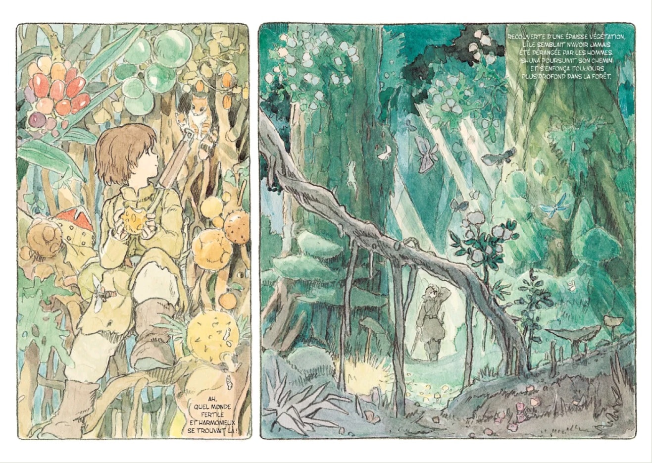 C’est ainsi. On peut difficilement l’expliquer, mais ouvrir un livre de Hayao Miyazaki, c’est entrer en poésie. À peine après avoir tourné quelques pages, lu quelques mots et la magie opère. Le dessin léger aux couleurs douces, les ciels étoilés et les vagues déferlantes, les visages enfantins ou terrifiants, les tentatives d’explications sont nombreuses et toujours incomplètes. C’est ainsi depuis toujours comme le démontre encore Le voyage de Shuna, publié pour la première fois en France, quarante ans après sa création au Japon. En feuilletant l’album, nous sommes en terrain connu et les références aux oeuvres déjà publiées dans l’hexagone sont nombreuses, comme un fil logique et cohérent dont Le voyage de Shuna serait le début et le film qui sort actuellement Le Garçon et le héron, la fin provisoire.