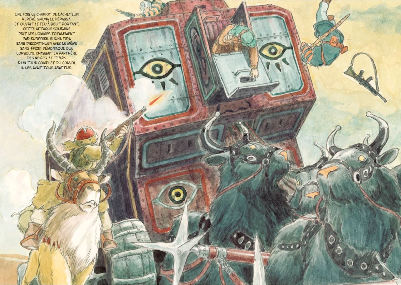 Inspiré d’un conte tibétain, l’histoire débute « au fond d’une ancienne vallée, creusée par un glacier » où « se trouvait un petit royaume oublié de tous ». Installés en milieu hostile, les habitants meurent de faim. Le jeune fils du roi, Shuna, décide de partir à la recherche d’une céréale miraculeuse, l’orge, qu’un étranger à l’article de la mort a trouvé loin, très loin dans les plaines de l’Ouest. Contre l’avis de son père il selle et chevauche son yakkuru pour un périple qui le mènera peut être vers les graines espérées mais d’abord dans l’univers des êtres divins, un royaume « où nait et retourne mourir la lune ». Les rencontres seront nombreuses, terrifiantes parfois, mystérieuses toujours, comme ces géants qui chancellent dans les forêts dévorés par de petits animaux avant de disparaitre. Mais comme souvent chez Miyazaki, le voyage permet aussi de découvrir des êtres bienfaisants, doux et tendres. Ici, c’est Théa et sa petite soeur, retenues par des marchands d’esclaves, libérées par Shuna, qui termineront le voyage.