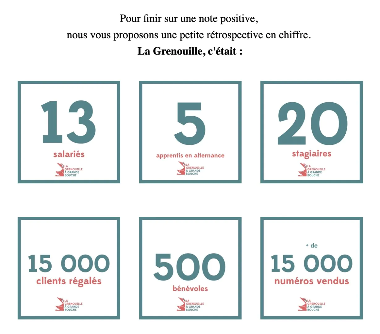 Nous espérons que les souvenirs des moments partagés auprès de cette grenouille gourmande, joyeuse et solidaire vous accompagneront dans vos projets futurs. Clients, bénévoles, partenaires, fournisseurs, lecteurs, abonnés, équipe salariée, stagiaires, prestataires, amis, toutes et tous qui ont soutenu de près ou de loin la coopérative :