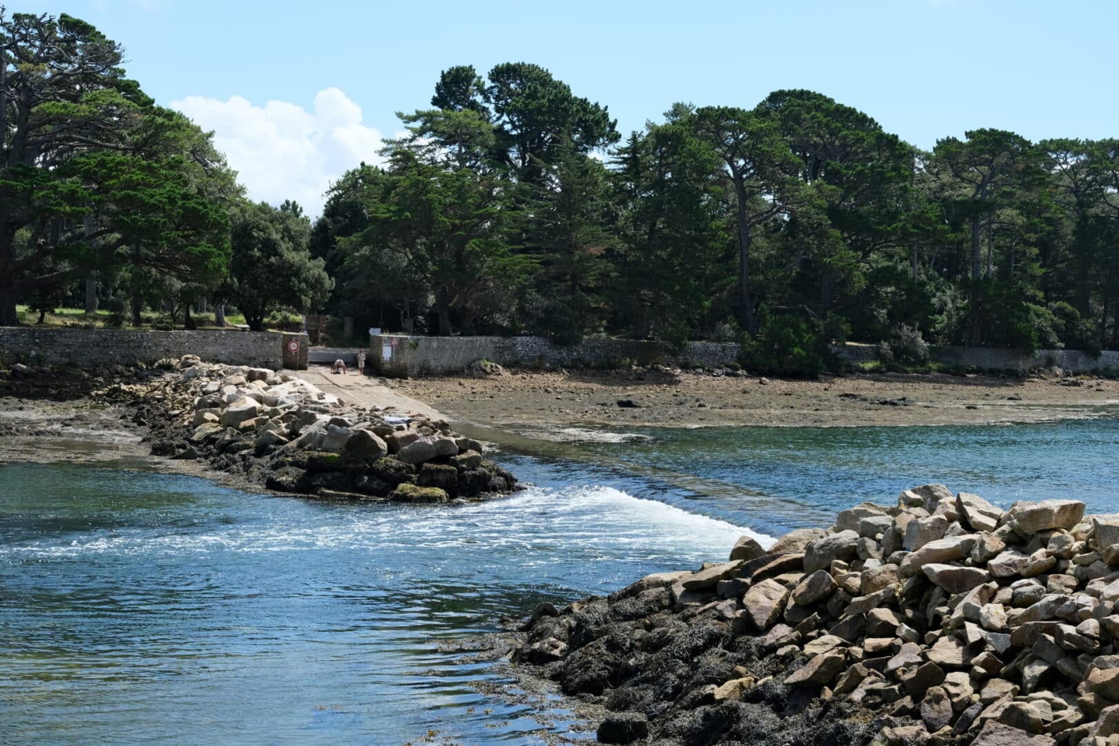 Pour visiter l’île Berder, les promeneurs sont invités à consulter les horaires de marées affichés sur le panneau à l’entrée du passage submersible, pour éviter de rester coincés plusieurs heures sur l’île inhabitée, jusqu’à la marée descendante.