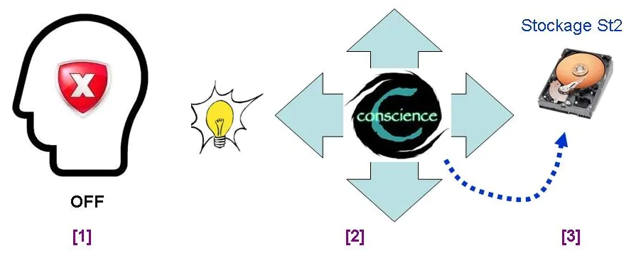 On remarque dans ce schéma une nouvelle liaison de données entre l’ensemble conscience/stockage-externe et le cerveau matériel. Un nouvel axe de recherche apparait : il concerne le point de jonction de cet ensemble au système nerveux central avec le mode de transmission des informations associées.