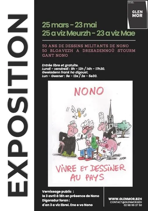 Et une exposition « 50 ans de dessins militants de Nono : vivre et dessiner au pays » qui va faire tourner les têtes dans toute le pays à commencer par celles du cœur de la Bretagne à Carhaix. En voici un qui n’est ni avare de rencontres, ni avare de dessins ! 25 ans dans deux publications de presse en Bretagne, ça vous pose un homme. Et cette expo, c’est jusqu’au 23 mai !, qu’on se le dise.