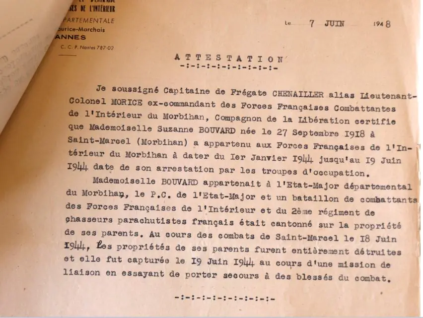 Au cours de la terrible bataille de 18 juin 1944, une intense fusillade éclate aux abords du manoir Sainte-Geneviève, propriété de la famille Bouvard, devenu un poste de secours important que les Allemands mitraillent de partout ! Le lendemain, ils perquisitionnent Sainte-Geneviève, où ils ont trouvé des pansements anglais : Suzanne Bouvard et sa cousine Annic Philouze secouriste pour la Croix-Rouge sont arrêtées puis conduites en direction de la prison de Nazareth, à Vannes.