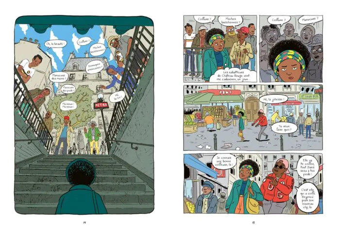 L’humour, comme dans ces pages délirantes consacrées à un salon de coiffure africain dans le quartier de Château Rouge, est omniprésent, un humour lucide, franc, qui montre les travers et les bonheurs des deux univers. Le sourire est parfois grinçant et Rouki n’hésite pas à dénoncer ses coutumes, des traditions éculées, un patriarcat féroce avec l’image pas très réjouissante de son père mis en pièce dans des scènes pourtant comiques. Le constat est même implacable en ce qui concerne le machisme des hommes africains sans oublier celui des « blancs » gentiment moqué.