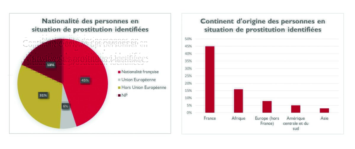 Sur les 661 personnes en situation de prostitution probable ou avérée, la majorité s’avère féminine à 87 % (573). Cependant, on dénombre 11 % (74) d’hommes et 2 % (14) de transidentitaires. Bien que la prostitution soit en grande partie une violence faite à l’encontre des femmes, les chiffres en hausse de la prostitution masculine, souvent absente du débat, ne sont pas à négliger.