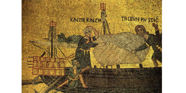 Les deux compagnons vivront des aventures sur la route de Mayence à Venise puis embarqueront ensemble sur un navire en direction d’Alexandrie. Le doge Justinien, plus haute autorité de Venise commanditaire de cette mission, apparaît comme un homme peu scrupuleux : « Porté au pouvoir par un complot, le doge imagine qu’un autre complot risque de le renverser : pour avoir l’âme en paix, il aurait dû tuer son frère Jean. Il le regrette. Quand on espère bâtir une république durable, il ne faut pas être trop civilisé. »