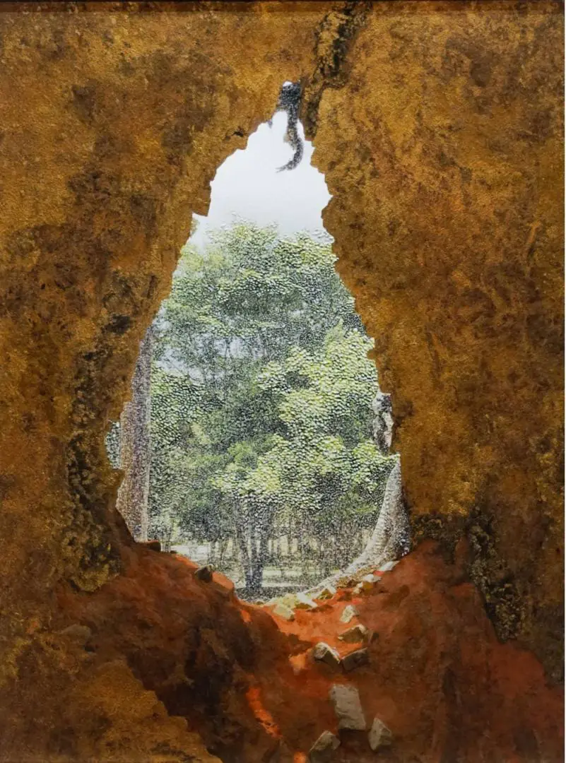 Raphaëlle Peria, Spelunca est templum, dessin à l’encre, pigment, dorure et grattage sur photographie, 60 x 45 cm, 2019 (crédit photographique Clara Benoit-Jacoby).