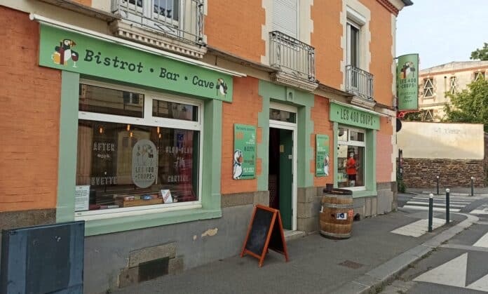 Au coin de la rue de la carrière, le petit immeuble du 10 rue de Lorient appelle l’œil avec ses tons ocres. Une enseigne verte arbore le dessin d’un macareux moine bon vivant qui semble maîtriser aussi bien le coup de fourchette que le lever de coude. Les 400 Coups, lit-on. Deux placards encadrant la porte précisent : bière de micro-brasserie, vins naturels au verre ou à emporter, jus de fruit local et artisanal, etc. La couleur est donnée.