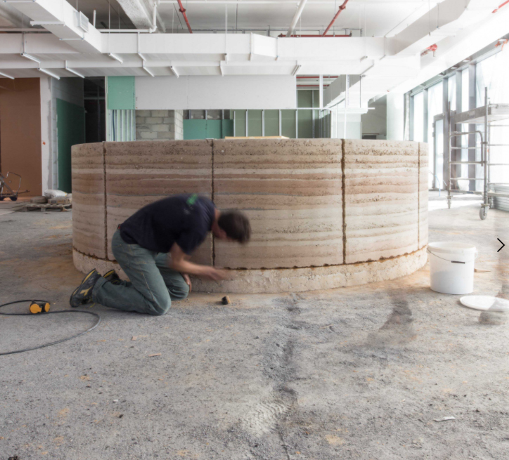 Afin de contraster avec l’ossature monumentale du hall d’accueil, Guénolé Jézéquel a en tête de ramener de la matière brute. À l’intérieur, le squelette de l’édifice laisse apparaître des éléments qui rappellent le schiste, le zinc ou bien le granit, dans le but d’évoquer la Bretagne. Le projet de l’architecte s’inscrit dans cette veine afin de continuellement créer un lien avec le territoire dans lequel on fabrique. De la même manière qu’une architecture se construit selon un discours cohérent, le mobilier peut créer ce dialogue avec le territoire dans lequel il s’insère. Pour cette raison, l’architecte a opté pour l’utilisation de la bauge, technique de terre crue, patrimoine de la région rennaise datant du XVIe siècle. Le pisé sera aussi présent. Provenant de la région lyonnaise, la technique consiste, comme la bauge, à compresser de la terre humidifiée en créant différentes superpositions de strates.