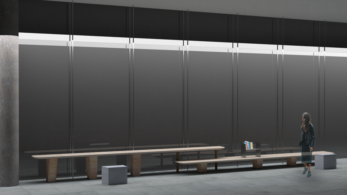 Le deuxième apport de mobilier se caractérisera par l’installation de bancs ingénieusement conçus de manière à s’adapter à tous. En jouant sur les volumes et le minimalisme des formes, ils pourront à la fois devenir table ou bureaux, comme si la bibliothèque se déplaçait jusque dans le hall.