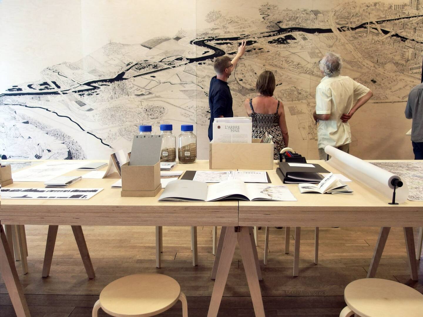 La redistribution des espaces est désormais assurée par une grande table d’environ 7 mètres sur 6 mètres, servant à la fois de banc, de table ou de scène. Elle permet d’avoir un regard extérieur sur l’ensemble des possibilités qu’offre les trois institutions. Point pivot du hall d’accueil, elle est une fenêtre qui ouvre le regard sur l’ensemble du bâtiment avec, au centre, un mât mobile créé par l‘Atelier Blam (Belvédère Bouroullec). Ce dernier, pas encore installé, tournera en permanence, tout en créant une image différente au fil des saisons.