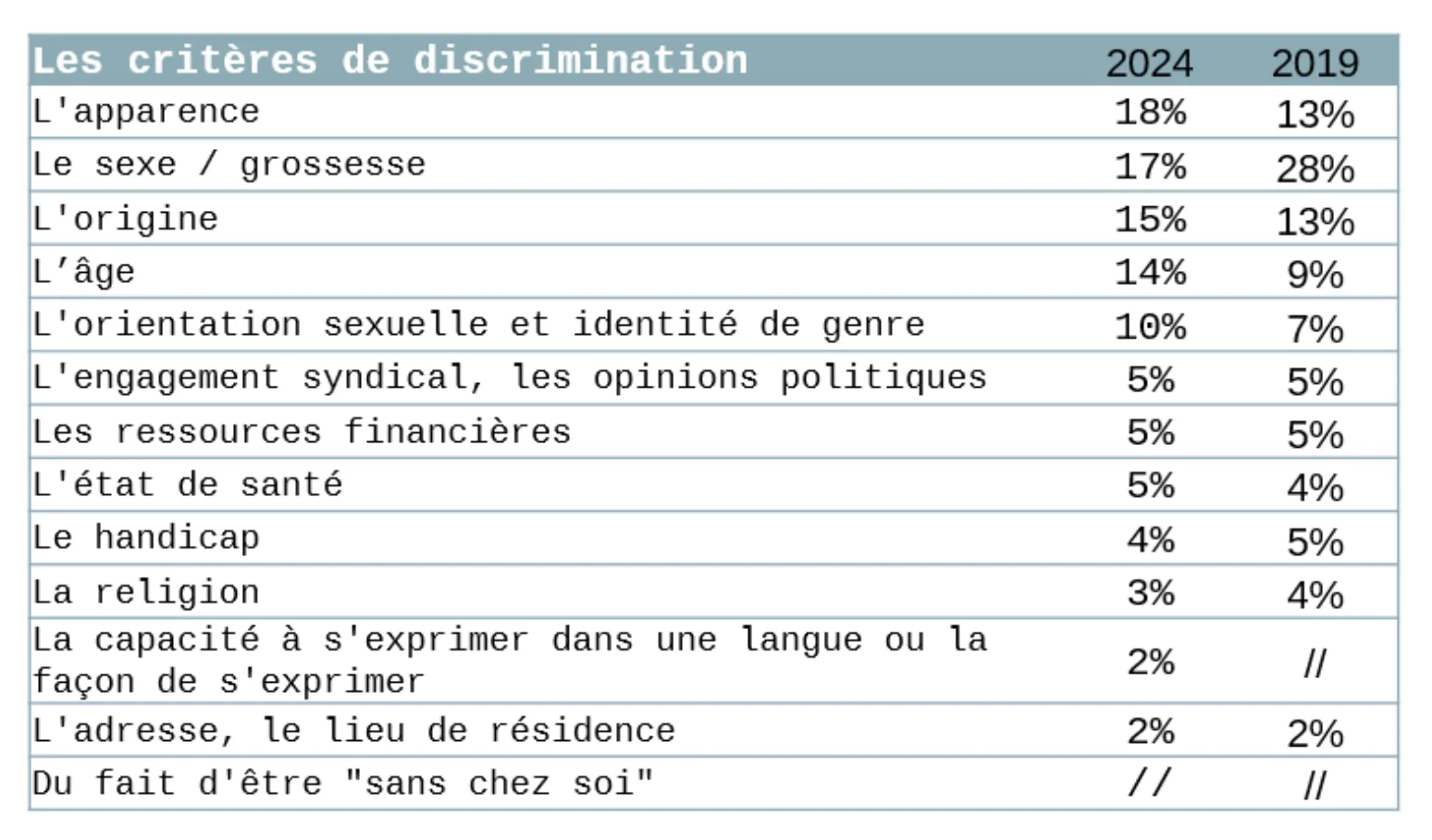 Sur les 1 573 témoignages recueillis en 2024, 61% des personnes interrogées déclarent avoir vécu des discriminations, contre 74% en 2019. Principaux résultats :