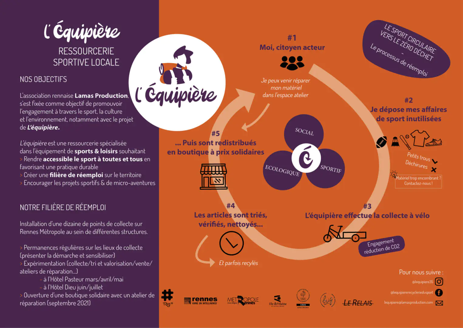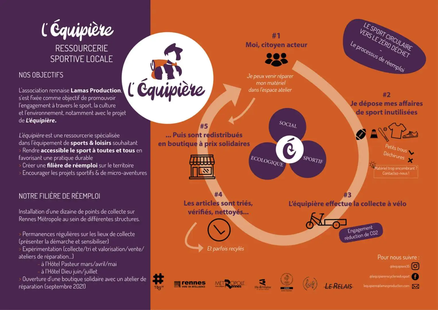L’équipière est une recyclerie d’équipements de sport et loisirs. Elle constitue un second souffle pour les articles de sport… Vous voulez donner vos équipements inutilisés ou en acquérir de seconde main à prix modique ? Parlez-en à votre équipière, en Halles en commun, 24 avenue Jules Maniez, à la Courrouze de Rennes, le mercredi et le vendredi de 11h à 13h30 et le samedi de 14h à 18h !