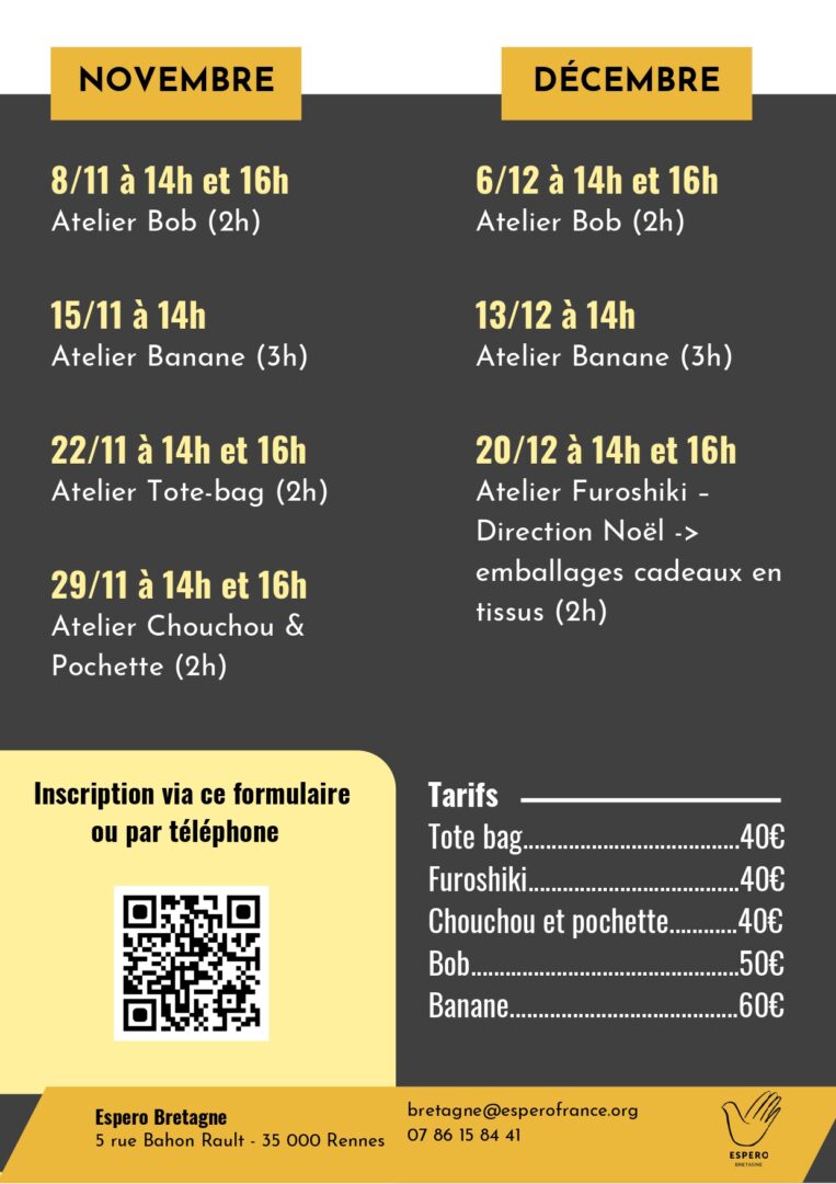 Les ateliers du couture pour particuliers proposés par l’association seront accessibles dès 8 ans. Les participants et participantes, 7 places par atelier, apprennent à créer des accessoires upcylés (bob, banane, totebag, pochette) à partir de leur garde-robe, en soutenant une association d’insertion professionnelle à Rennes. Les vieux vêtements sont ainsi réutilisés pour concevoir des accessoires stylés & pratiques.