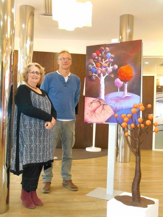 Les deux artistes confient que le montage de l’exposition s’est fait tout simplement. Le sculpteur a créé un jardin aux allures féériques et poétiques : entre saule pleureur et arbre à nuages… De toutes tailles, des arbres en acier se dressent dans l’espace lounge, à la fois immobiles et comme vivants. Le premier de la collection ouvre le chemin : un bonsaï aux racines imposantes. Sur les murs, les peintures de Marie-Pierre Jan rehaussent le 18 Quai de ses traits. Les deux pratiques artistiques se font face, se croisent et se retrouvent dans un point commun : l’arbre. L’arbre, présent dans chaque coup de couteau qui crée la peinture comme dans chaque maniement de l’acier qui construit la sculpture.