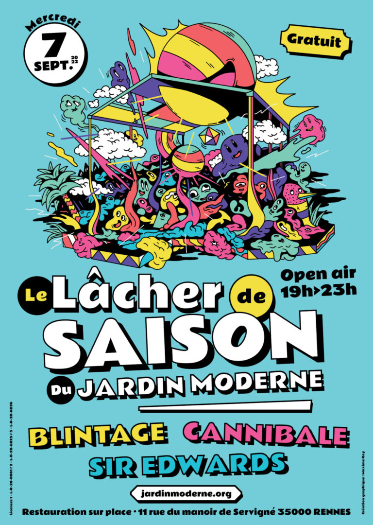 Les premiers rendez-vous de la nouvelle saison pointent le bout de leur nez. Mardi 6 septembre 2022 débute l’exposition photo Let In The Light de Karine Baudot. Le lendemain a lieu le Lâcher de saison, l’un des cinq temps forts de l’année, avec la Bambûche de Noël, Les Contrefaçons, où les groupes adhérents sont invités à jouer des reprises selon une thématique (cette année, les musiques de film), le mini festival Spring Rec dédié aux labels indépendants, et l’Open Garden de fin de saison. Événement gratuit, comme tous ceux organisés par le Jardin moderne, le Lâcher de saison verra se produire trois groupes et artistes, les Normands Cannibale, dans un registre hybride entre rock garage et musique brésilienne, le groupe rennais Sir Edwards, rock psychédélique, et Blintage, techno chantée. Le chapiteau extérieur, acquis en fin de saison dernière, abritera le public en cas d’intempéries.