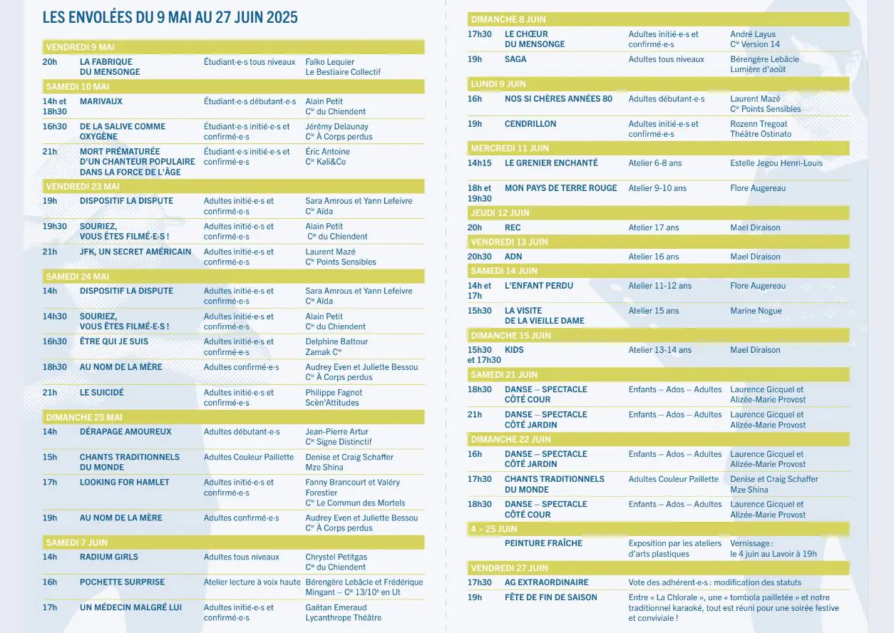 Ce sont près de 700 artistes amateurs qui monteront sur scène pour partager leurs créations avec le public du 9 mai au 27 juin 2025. Cette 43e édition est placée sous le signe de La Fabrique du mensonge, un thème ludique et provocateur qui interroge nos rapports à la vérité, aux récits et aux illusions. Manipulations, travestissements, dissimulations, fausses pistes : les spectacles jouent avec les codes et les perceptions, pour mieux bousculer nos certitudes. Au total, 30 spectacles et une exposition, répartis sur 5 week-ends, investiront les différents espaces de la Paillette, du Théâtre au Lavoir, en passant par le parc Saint-Cyr.