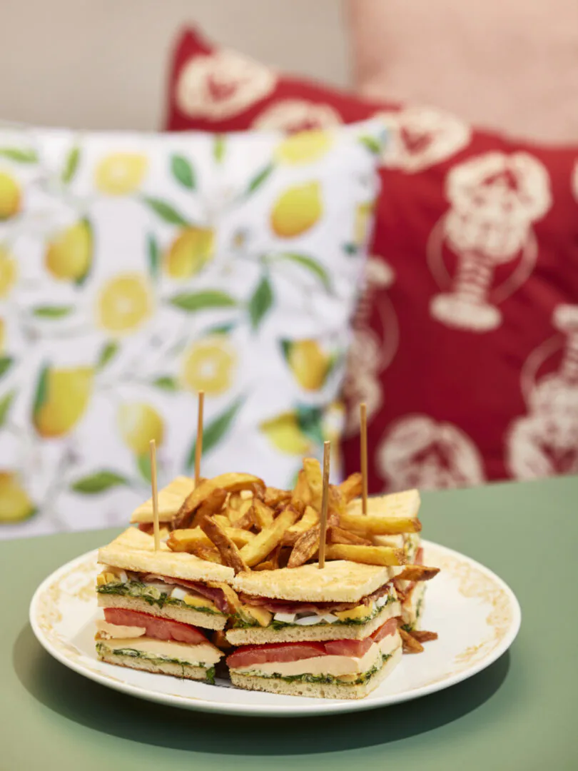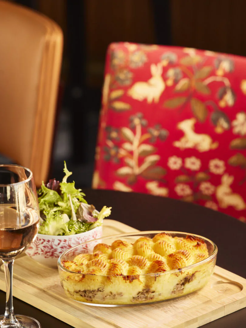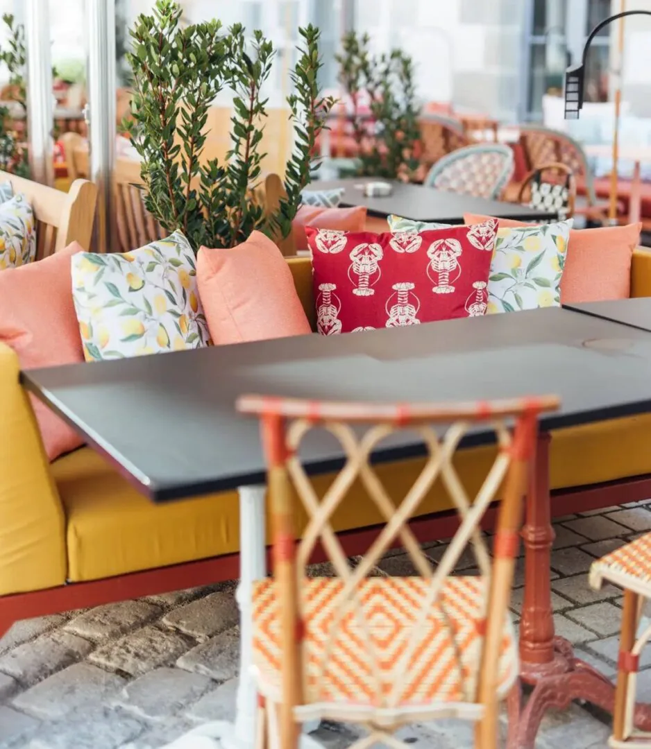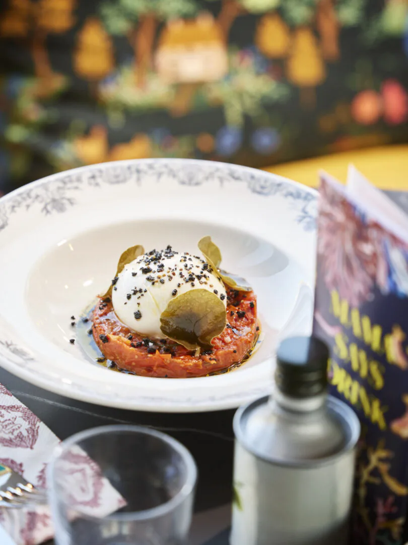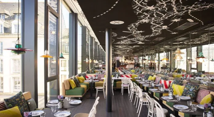 Au demeurant, Mama Shelter Rennes est sis au 3 place de la Trinité. L’établissement de 11000 m2 propose au public une réception et un bar en rez-de-chaussée, un spa (piscine, hamam, sauna) en sous-sol, un Mamm’s Bar avec dj-set vespéral ainsi que trois salles de karaoké, un confortable hôtel de 119 chambres réparties dans les étages et, au troisième, un étonnant restaurant panoramique qui offre de découvrir une des places les plus fameuses de Rennes sous un angle tout à fait inattendu et vraiment stupéfiant. Le bar largement ouvert sur la place des Lices révèle une splendide cour intérieure triangulaire dont nombreux Rennais n’avaient sans doute jamais soupçonné l’existence. La terrasse est spacieuse, l’intérieur tout autant ; sur le côté droit de la réception de l’hôtel, un salon bien douillet accueille les amateurs de lieux intimes et feutrés. Les couleurs n’y sont pas discrètes, mais ouvertement joyeuses et chaleureuses. Elles annoncent haut et fort une volonté de convivialité et de bonne humeur qui se retrouve aussi bien dans les chambres que dans le restaurant.