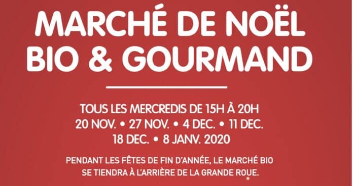 Mail François Mitterrand de Rennes, derrière la grande roue, un Marché de Noël Bio et Gourmand se déroulera en musique, avec des créateurs locaux et des artisans bio, tous les mercredis du 20 novembre 2019 au 8 janvier 2020 avec la Galette des Rois dans la continuité de la fête de l’Épiphanie.