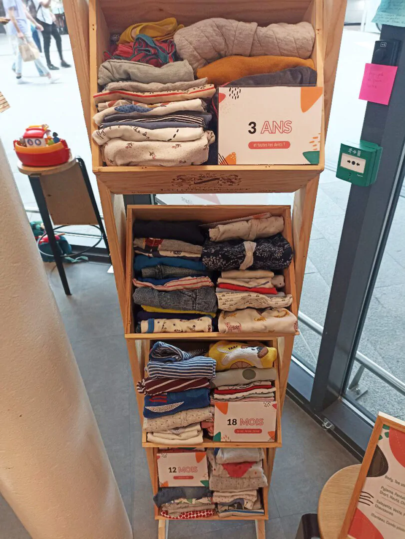 Après s’être créé un stock de 1 000 pièces grâce à des bêta-testeurs et à l’achat de quelques pièces en seconde main, « pour étoffer la collection et avoir toutes les tailles », Martin a ouvert sa première boutique éphémère à la Station Maif dans le but de faire connaître son concept. « Tout l’enjeu est d’avoir un stock suffisant afin qu’il y ait suffisamment de choix pour les échangeurs. » Ne pouvant mettre à disposition tout son stock dans l’espace de la station, Martin a mis en place des créneaux de réservation afin de ramener les tailles nécessaires aux parents.