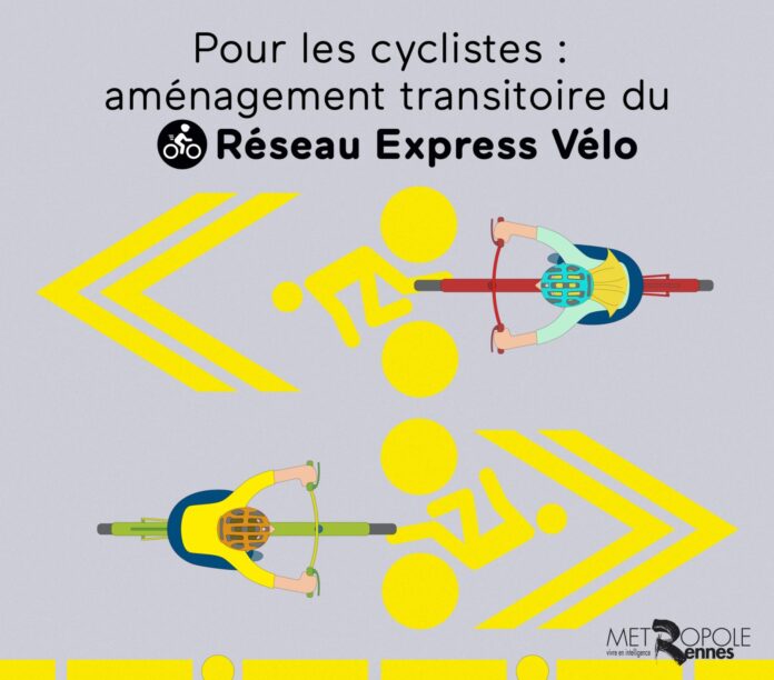 → Des aménagements qui étaient déjà à l’étude dans le cadre du Réseau Express Vélo (REV), qui comptera, à terme, plus de 100 km de pistes cyclables entre Rennes et les communes de la première couronne, ou du schéma directeur vélo (plus de 500 km d’itinéraires cyclables dans les 43 communes d’ici 2030). Ces aménagements vont être déployés de manière transitoire mais préfigurent des aménagements définitifs qui seront tous réalisés à l’horizon 2024. Il s’agira donc de compléter le REV existant avec des aménagements transitoires facilement déployables pour garantir la sécurité et le confort des cyclistes.