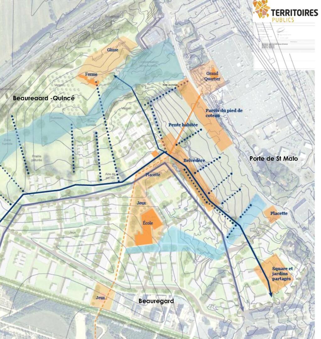 formée par une pente douce vers le boulevard de la Robiquette et marquée par des haies bocagères à préserver, sera aménagée sous forme de parc dans le prolongement de celui de Quincé. Des liaisons douces sont prévues pour connecter le quartier de Beauregard avec le secteur Grand quartier et Chesnay-Beauregard.