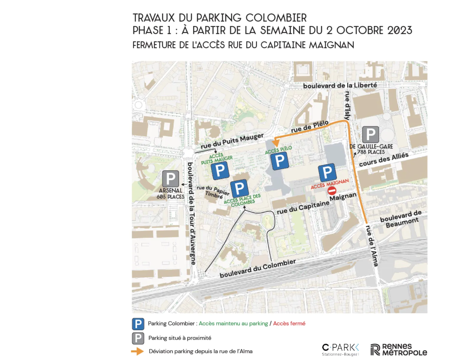 Les 4 entrées du parking seront condamnées à tour de rôle. Le chantier débutera la semaine du 2 octobre 2023 avec la fermeture de l’entrée Sud côté rue du Capitaine Maignan pour une durée d’approximativement un an. Le suivi de fermeture des différents accès sera communiqué selon l’avancement des travaux et disponible sur c-park.fr.