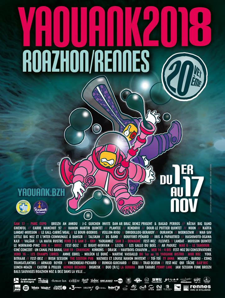 Jean-Charles Guichen, Nâtah Big Band, Plantec, Carré Manchot 97… voici quelques-unes des têtes d’affiche qui composeront la 20e édition de Yaouank du 1er au 17 novembre. Toujours porté par l’association Skeudenn Bro Roazhon et toujours dans un but de faire découvrir la culture bretonne au plus grand nombre comme c’était déjà le but en 1999. « Une journée pour découvrir, une nuit pour la fête. C’était le slogan du festival lors de son lancement », se souvient Glenn Jegou, directeur artistique de Yaouank.