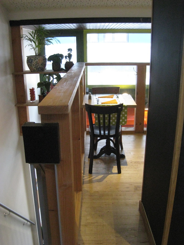 S’il est possible de déjeuner ou dîner en terrasse, les actuelles températures hivernales invitent à se replier à l’intérieur et profiter des huit places du bas ou des seize places de la salle du haut après avoir gravi un escalier qui, à lui seul, vaut tous les apéritifs… En cohérence avec leur intention, cette salle donne un apaisant sentiment de « comme à la maison », sentiment que la nourriture viendra confirmer. Pour ceux qui n’auront pas de place ou, le cas échéant, peu de temps, il est possible de passer commande au Sans chichi et d’emporter les petits plats concoctés par Samia et OT. Cette formule répond à un vrai besoin dans ce quartier et remporte déjà un franc succès.