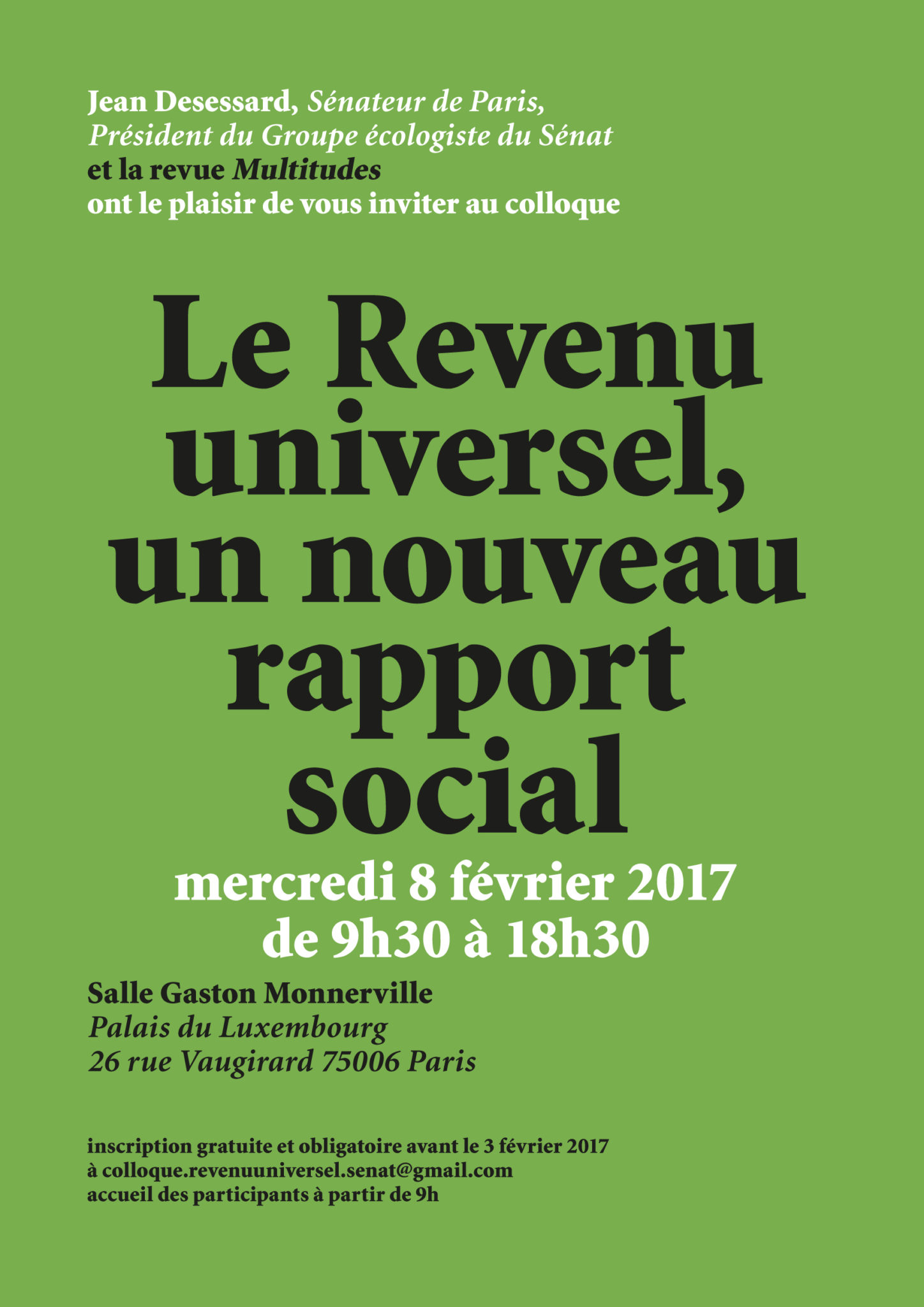 Le revenu universel a trouvé son exposition, et pas n’importe où : au Sénat. Le 8 février 2017, toute la complexité de cet enjeu de société trouvait son expression. Les forces en présence ? La revue Multitudes et sa cohorte de philosophes et sociologues, les sénateurs « de tous bords politiques » et leur rapport, rendu le 9 octobre 2016, le Mouvement Français pour un Revenu de Base, un conseiller de Benoît Hamon, et dans la salle, Réseau Salariat, partisans, opposants, néophytes ! En somme, presque toute la sphère qui gravite autour de ce revenu universel si controversé. Le MRFB, une association créée en 2013, qui se donne « pour mission de promouvoir le revenu universel dans le débat public, jusqu’à son instauration », propose aux organisations politiques de se poser en acteur et consultant. Elle donne du revenu de base une définition qui aide à le comprendre : il est versé à chaque individu (individuel), de sa naissance à sa mort (permanent), sans aucune contrepartie (inconditionnel), quel que soit son revenu ou sa situation professionnelle (universel), en s’additionnant aux autres revenus et à certaines allocations (cumulable). À cela, rajoutons qu’il est un droit fondamental pour tous les citoyens (inaliénable).