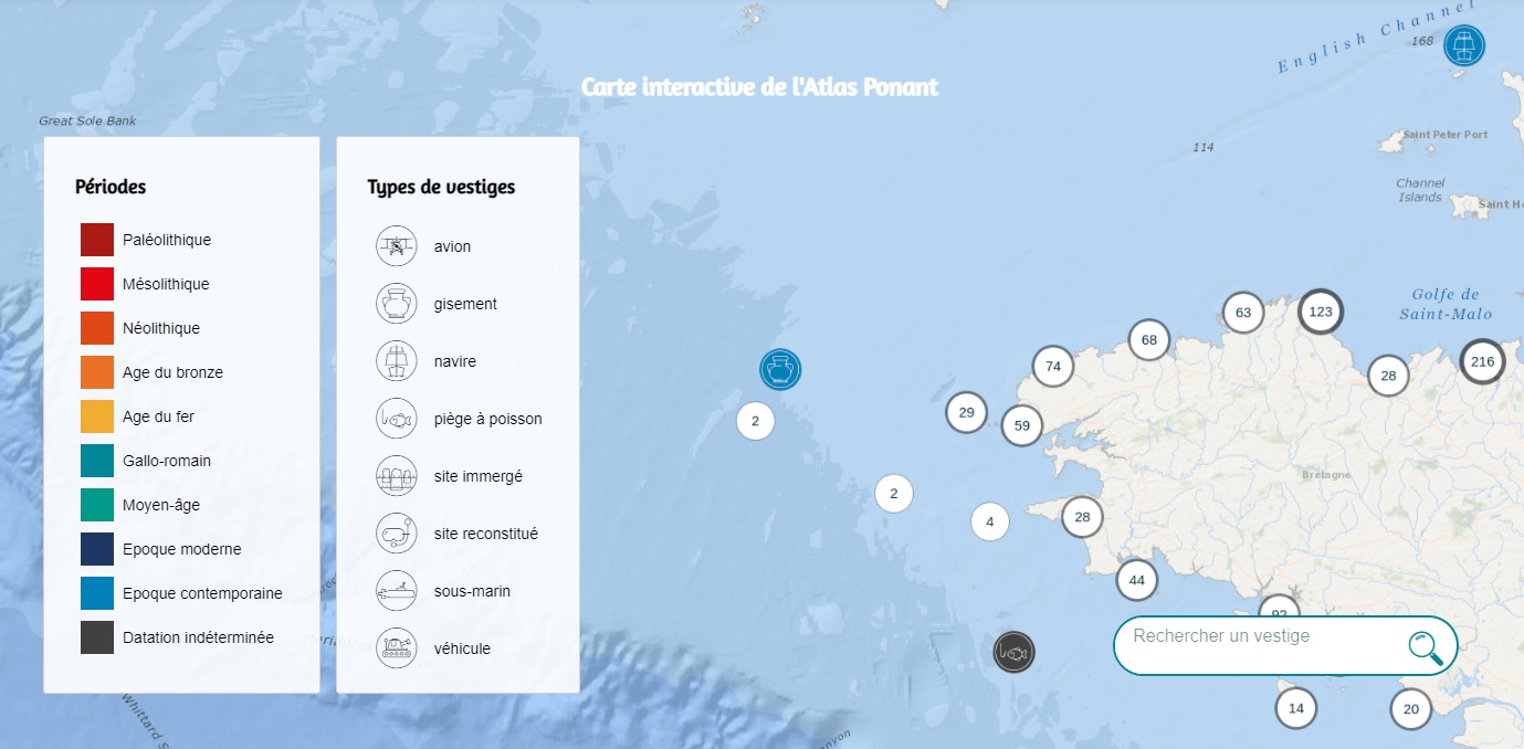 Découvrez les richesses archéologiques des mondes immergés avec le nouveau site internet Atlas Ponant. Le site offre un accès, par le biais d’une interface cartographique, à l’ensemble des données archéologiques, des notices scientifiques et iconographiques issues des recherches archéologiques sous-marines menées depuis plus de 50 ans. Engagé depuis 2005 sous l’égide du Département des Recherches Archéologiques Subaquatiques et Sous-marines (DRASSM, Ministère de la Culture), le projet Atlas Ponant est le fruit d’une collaboration entre archéologues, historiens, archivistes et passionnés de plongée. Il a pour ambition de valoriser la mémoire immergée des côtes atlantiques françaises.