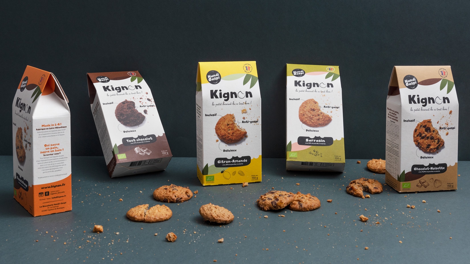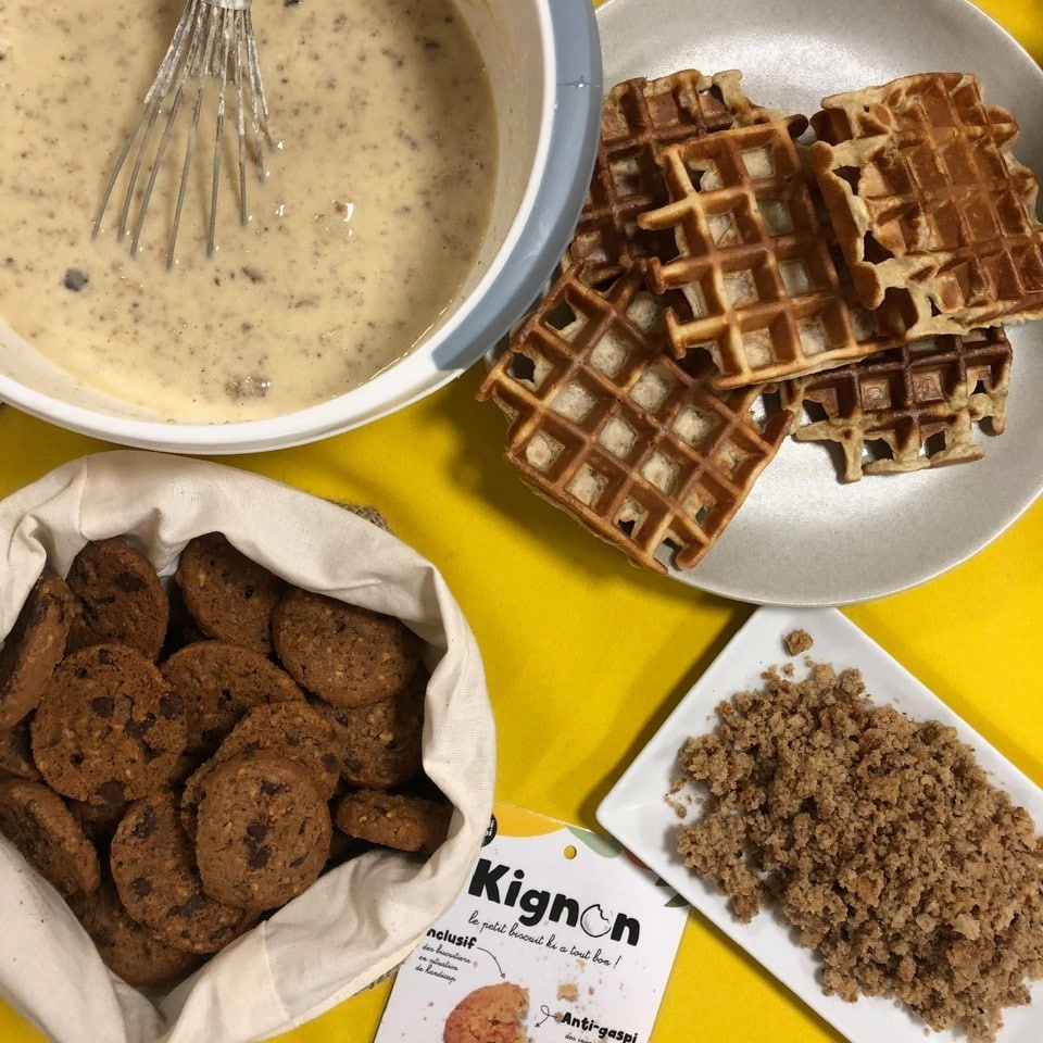 Chaque matin, l’entreprise fait le tour des boulangeries bio du secteur et achète les invendus pour 50 centimes d’euro le kilo. La biscuiterie Handi-Gaspi est installée dans l’Établissement ou Services d’Aide par le Travail (ESAT) de la commune : il emploie une quarantaine de personnes dont la majorité sont en situation de handicap mental et psychique. Chaque travailleur a sa responsabilité, en fonction de ses capacités. Aujourd’hui la biscuiterie handi Gaspi vend ses cookies dans plus de 500 magasins bio et boutiques Vrac en France.