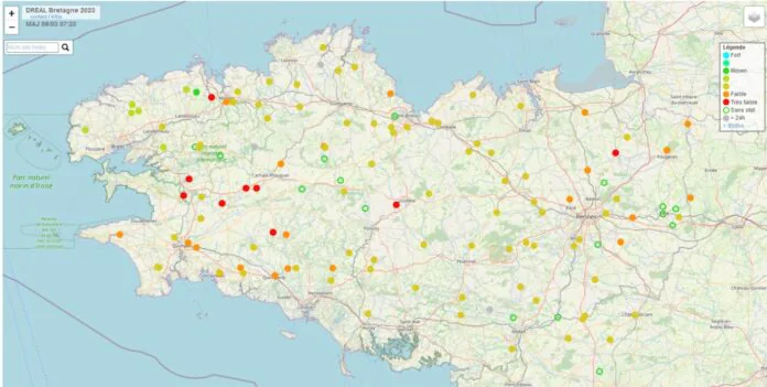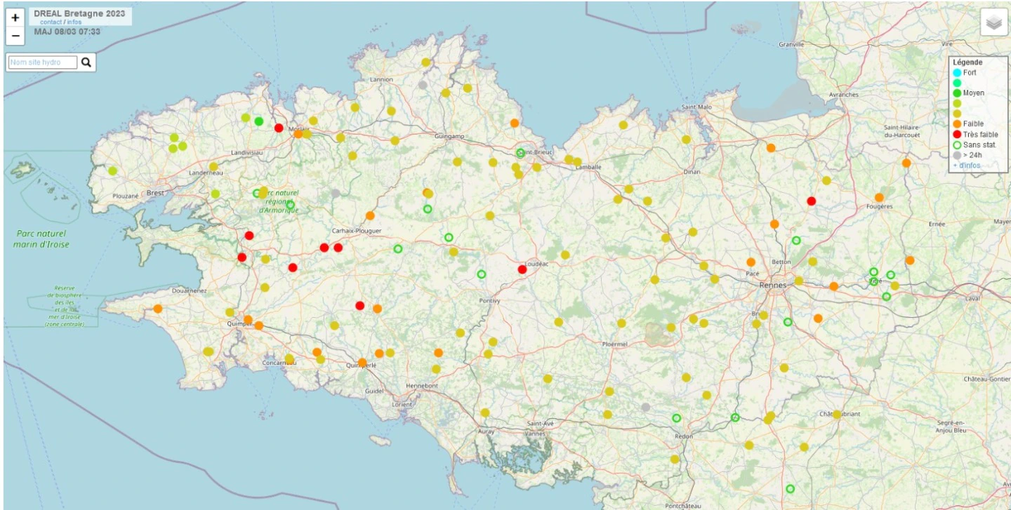 Carte des débits de cours d’eau mesurés par le réseau de suivi de la DREAL – situation au 08 mars 2023 : https://www.hydrologie-bretagne.fr/