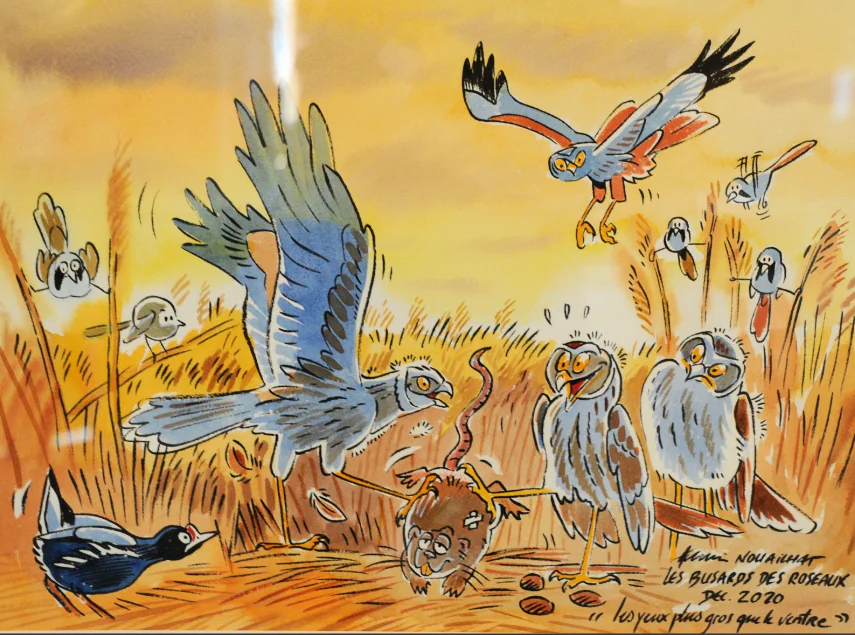 La Réserve naturelle des marais de Séné dans le Morbihan expose Plumes d’humour depuis la mi-mars et jusqu’au samedi 15 juin 2024. Elle met à l’honneur les œuvres de l’aquarelliste, l’explorateur, le naturaliste et le militant qu’a été Alexis Nouailhat, disparu en 2021.