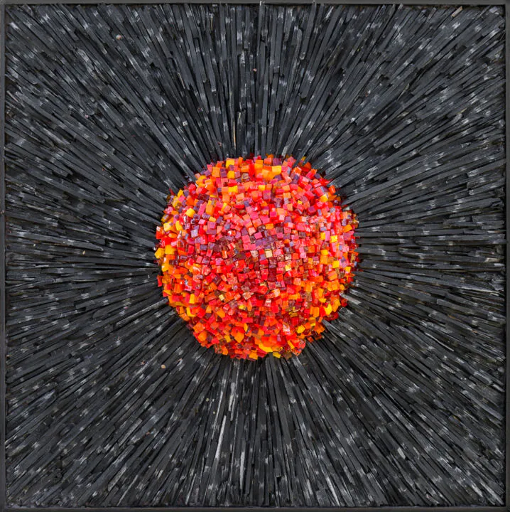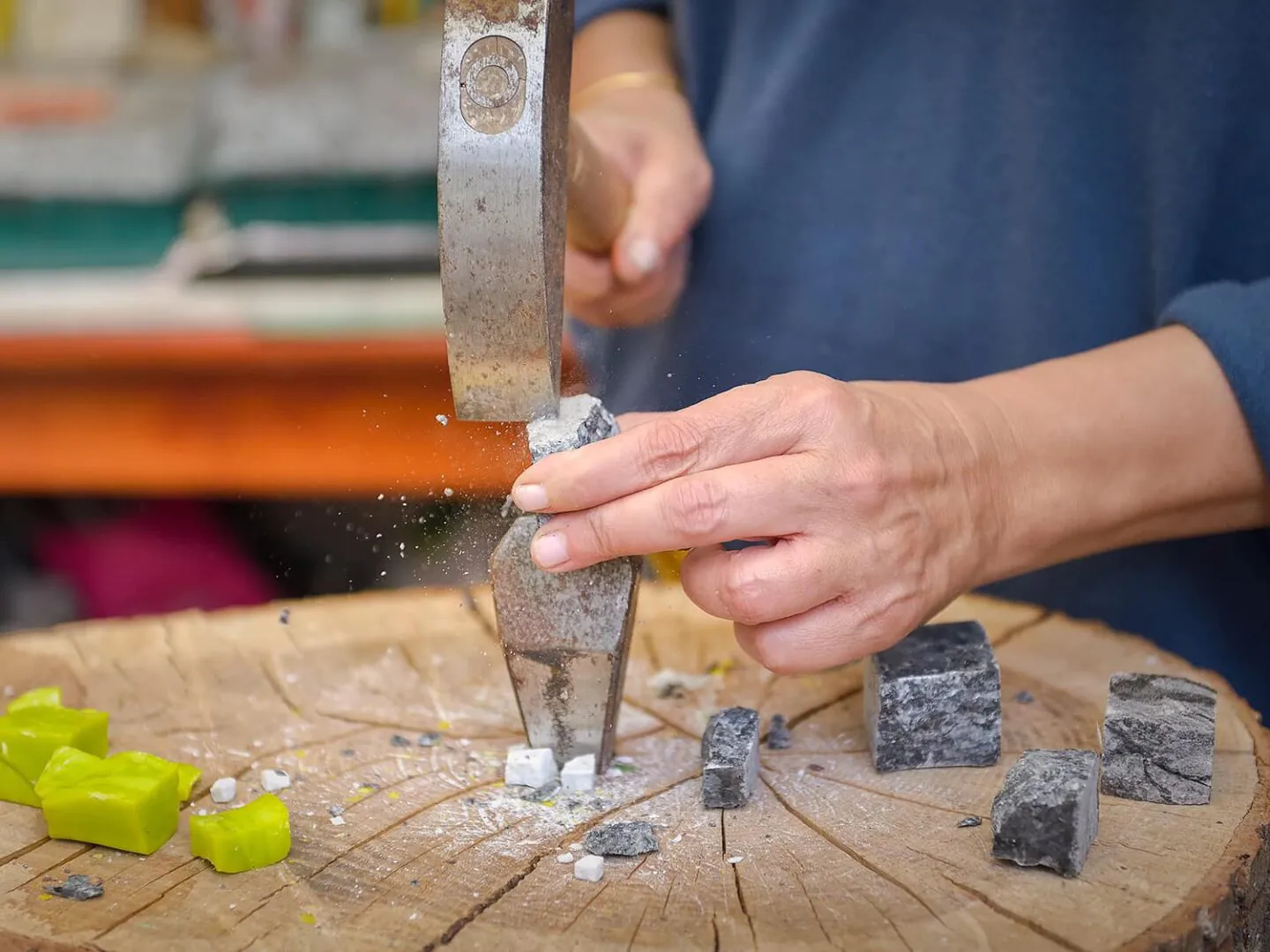 Aujourd’hui, Fabienne le Pajolec taille la pierre et le verre artisanal à la marteline sur un taillant. Ces outils, utilisés depuis l’antiquité romaine, lui font découvrir ce savoir-faire ancestral et pour l’artiste il s’agit d’une révélation et d‘un véritable coup de cœur. Chaque fragment de marbre ou de verre est taillé et ajusté pour former la base artistique de ses œuvres.