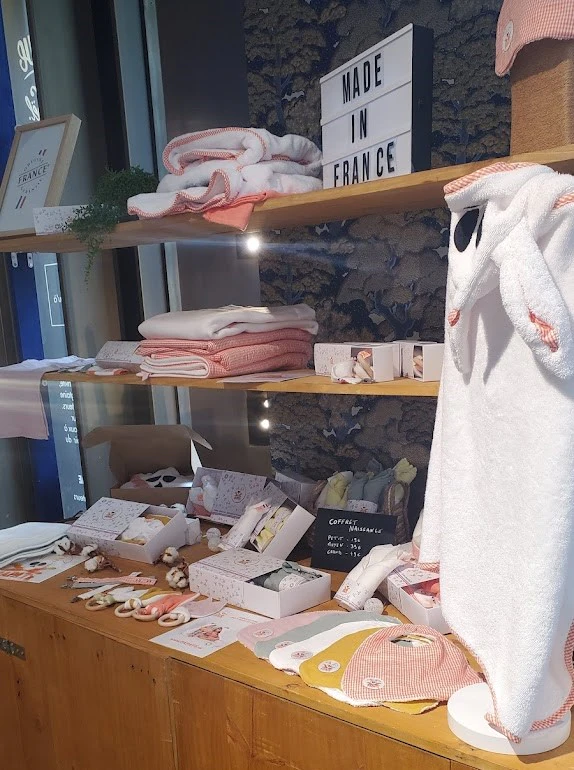 Toute la gamme de vêtements et l’ensemble des articles de puériculture sont garantis 100% biologiques : pour le bain (lingettes lavables, gants de toilette, capes de bain, etc.), les bavoirs pour les repas, les accessoires pour le lit (les nids d’ange, les couvertures polaires, les gigoteuses, etc.), même les anneaux de dentition et les langes lavables revenus très tendance. Tous ces produits sont fabriqués en France. Les fournisseurs les plus proches sont installés dans le Morbihan : l’Esat Saint-Georges à Crac’h pour les langes ; les chaussettes à Cholet (Maine-et-Loire) ; les turbulettes, les couvertures à Cambrai (Nord) ; les tee-shirts et les bodys viennent de Troyes (Aube) et les sweat-shirts de Marseille.