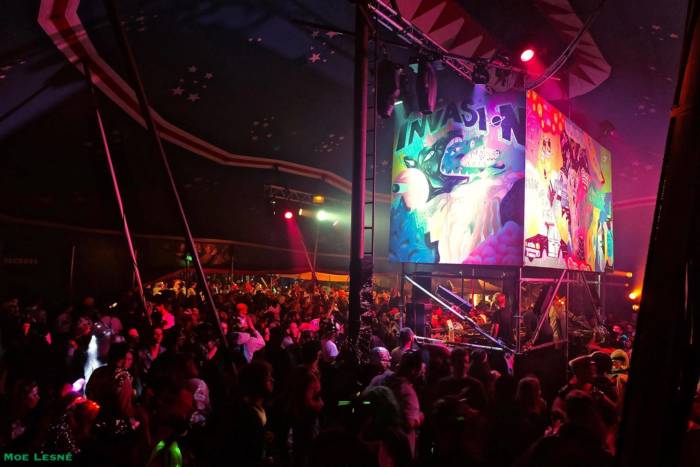 Lancée en 2005, l’association Sweatlodge est surtout connue pour organiser les Sweatlodge party, des fêtes électro déguisées sous chapiteaux. Basée à Nantes, elle s’est développée en tant que plate-forme de production dédiée aux cultures sound system et aux arts forains. Les activités proposées à la Sweatlodge party sont exclusivement produites par l’association et existent indépendamment les unes des autres. « Les chapiteaux peuvent être loués dans un coin, les entresorts ramenés dans des festivals, et les musiciens du crew (Le Crabe, Les Fantastiks, ou encore Redux) mêlent leurs activités chacun de leur côté », rappelle Karoll Smith, chargé de la communication à Sweatlodge. Les membres du collectif, influencés par la free party et par la musique électronique, ont décidé de créer Sweatlodge pour proposer une version des fêtes beaucoup plus colorée et plus déguisée des chapiteaux de cirque. Tous les ans, l’association s’installe le temps d’un week-end dans les grandes villes du nord-ouest, de Rennes à Nantes en passant par Saint-Nazaire, pour représenter le spectacle vivant d’aujourd’hui. À défaut d’être défini comme une fête avec des enceintes et des Dj’s, l’esthétisme et la construction caractérisent plus que tout Sweatlodge. Le public, relativement jeune, autour de 25 ans, doit venir déguiser pour participer à la fête. « En demandant aux gens de se déguiser, il y a une réelle invitation à les rendre plus acteurs de la scène et de la fête. Dans les entresorts, il y a une vraie interaction entre le public et les membres du collectif ».