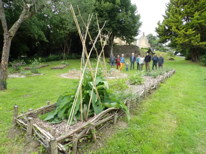Les travaux ont commencé au printemps 2020 avec le soutien des services techniques de la commune, pour les apports de matériaux, la terre et l’élagage des arbres. Les bénévoles se sont attelés à nettoyer la parcelle, l’ont désherbée et ont taillé la haie, etc. Puis la structure, sur laquelle le jardin médiéval allait prendre place, a pris forme. Des parterres en buttes ont été confectionnés, des carrés séparés les uns des autres par du tressage de branches, comme cela se faisait au moyen-âge. D’autres techniques médiévales ont été reproduites, le tout assemblé à partir du bois taillé préalablement. Le parterre symbolique en forme de triskel breton n’a pas été oublié ! Au sol, un paillage a été répandu servant d’une part à protéger la terre du froid et pour pouvoir la travailler durant tout l’hiver, et d’autre part pour éviter la pousse des herbes indésirables.